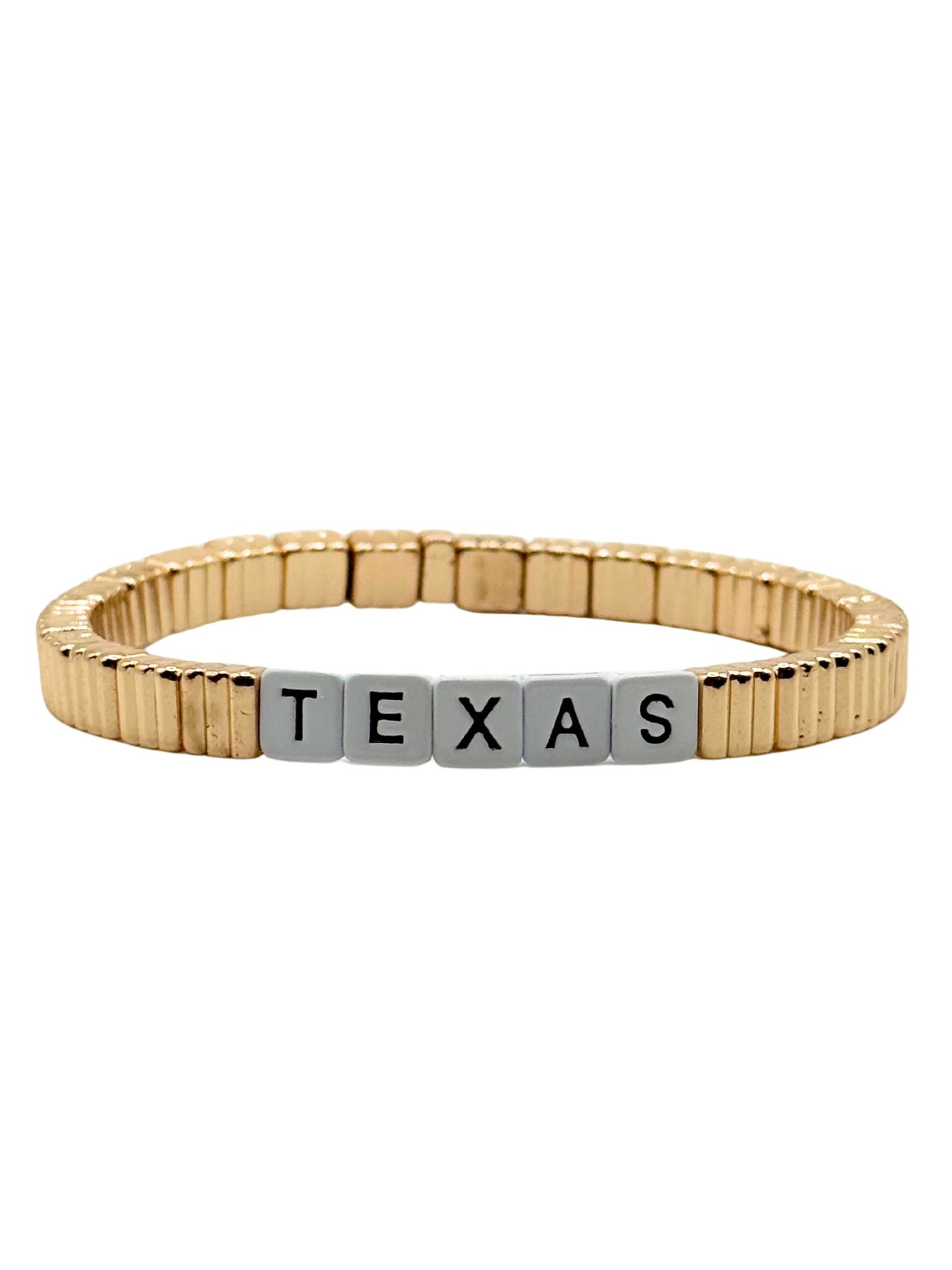 Our TEXAS Line Bracelet features textured gold beads in a thinner size with the saying “TEXAS.” Part of our stackable words collection, each bracelet is 7" in length, 7MM bead diameter and is a slip-on-style. All of our single bracelets are designed to be stacked or they can be styled to wear alone.