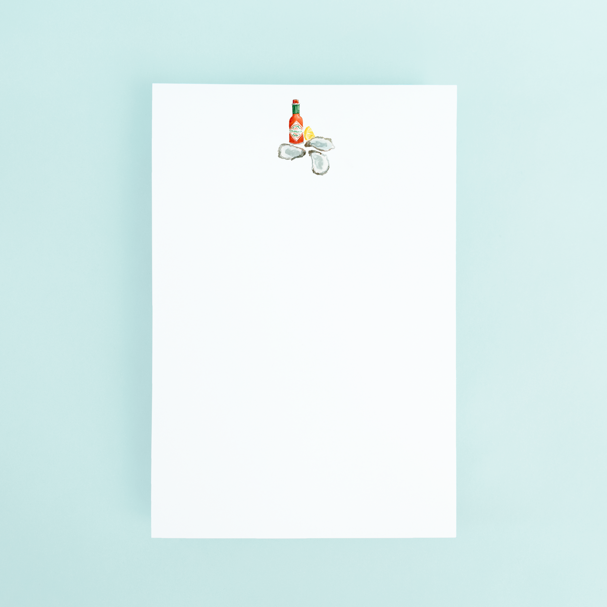 Add some flavor to your notes with our 4 x 6-inch notepad featuring an original watercolor design by Dallas-based artist Taylor Paladino. The beautifully depicted bottle of Tabasco hot sauce and oysters complete with a lemon wedge on the top of each of the 50 sheets of plain unlined paper is a delicious sight that will spice up your day.
