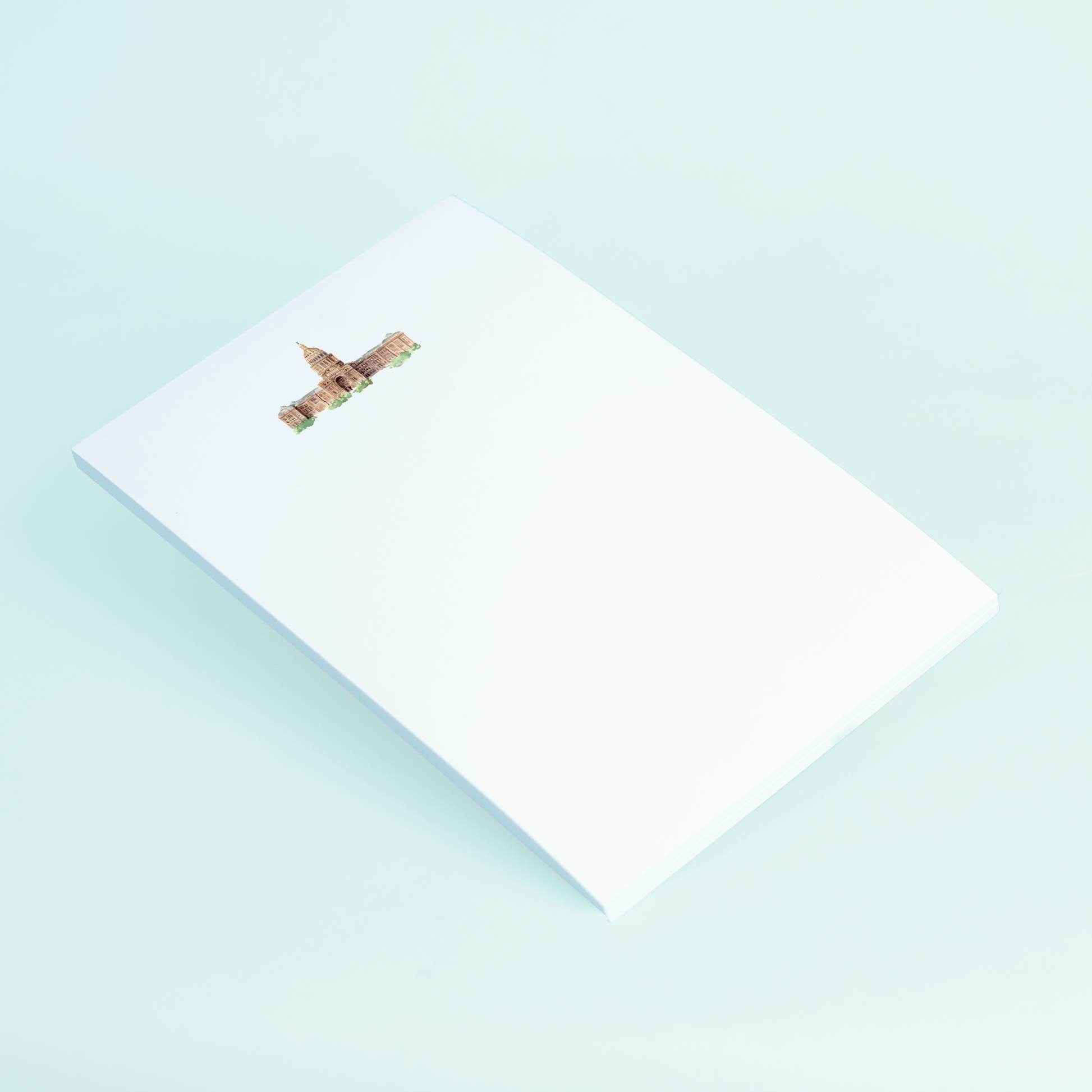 This 4 x 6-inch notepad featuring an original watercolor design by Dallas based artist Taylor Paladino is the perfect addition to any desk or workspace. The Texas State Capitol Building is beautifully depicted on the top of each of the 50 sheets of plain unlined paper. The intricate details and soft colors of the watercolor design make this notepad stand out. Each sheet is perfect for taking notes, writing lists, or jotting down ideas.