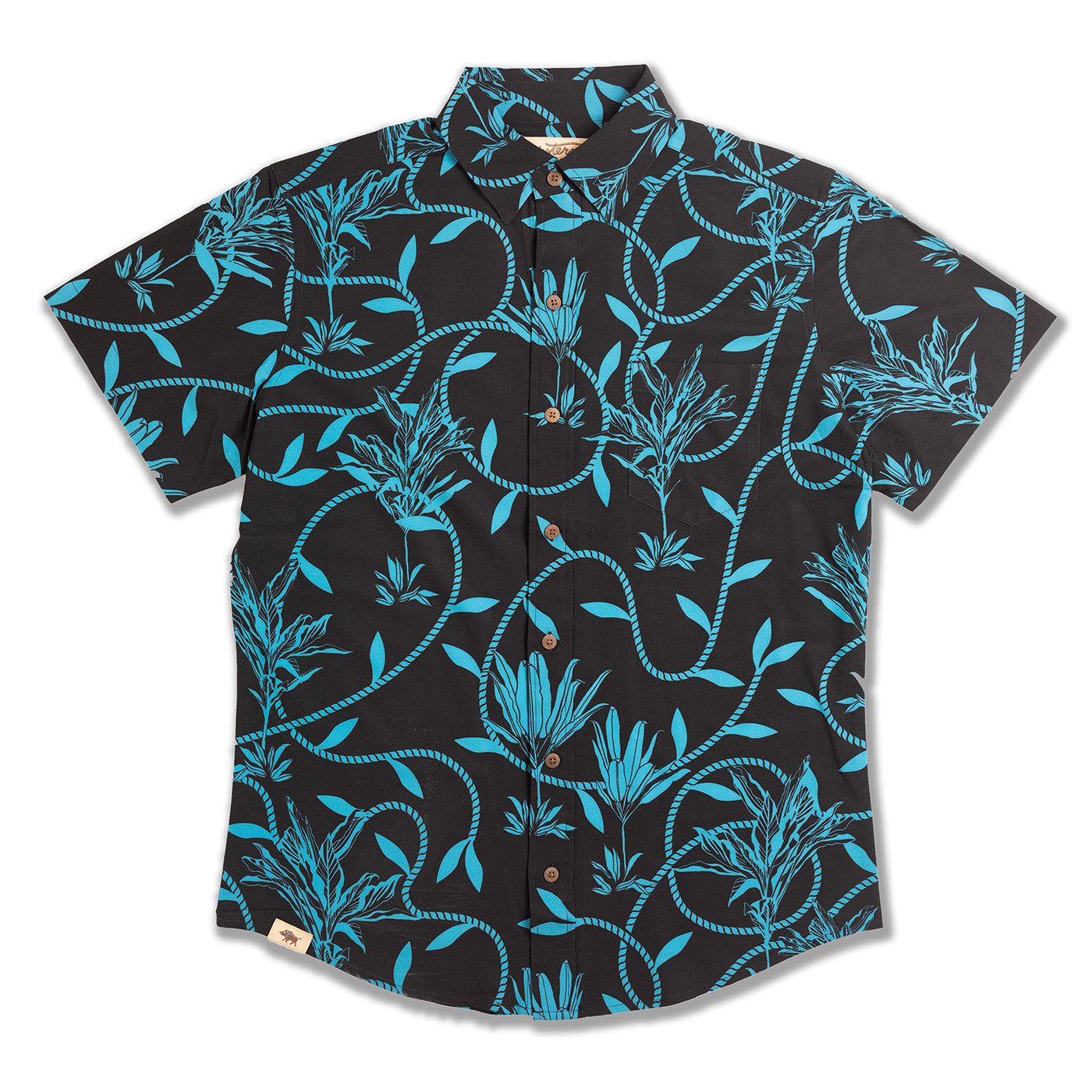 This floral print features the leaves of the Ti plant. Ti can be woven into a beautiful lei, featured here flowing throughout the print. This highly prized plant also is used for many ceremonial and domestic purposes in Hawaii.