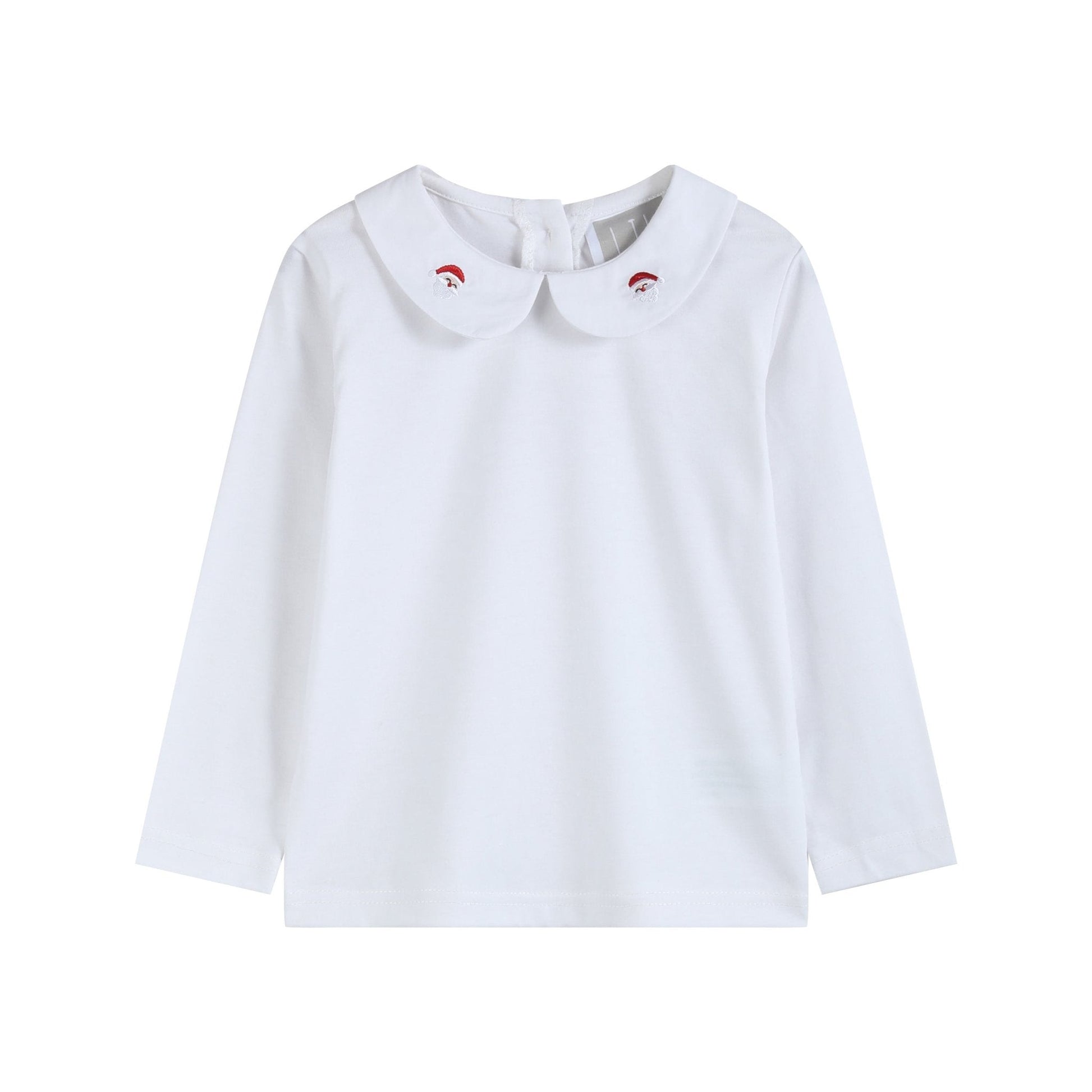 Celebrate the season with this White Cotton Santa Collared Shirt, perfect for little girls. Made from 100% cotton for comfort and softness, this long-sleeved shirt features an adorable collar embroidered with festive Santas. Ideal for Christmas gatherings or seasonal wear, it pairs beautifully with our Ruffle Jumper Dresses.