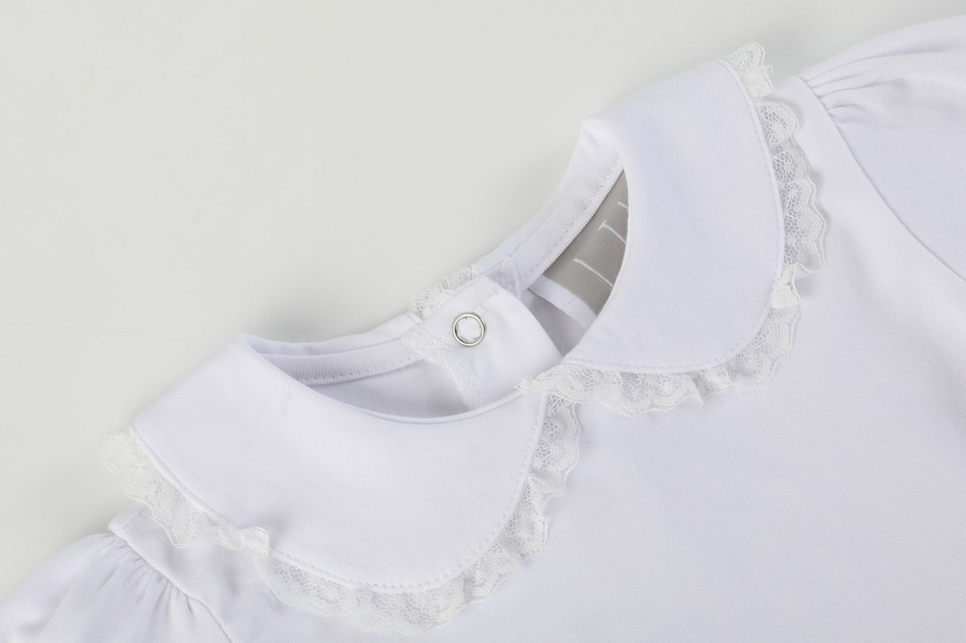 The perfect basic staple for your little sweetie's closet. A beautiful long short sleeve bodysuit made in the softest cotton. Detailed with a pretty lace trimmed collar to make it the perfect option for under rompers, overalls or even on its own. This collared romper is also great for embroidery and monograms to make it a one-of-a-kind look. Sizing goes up to 2T.