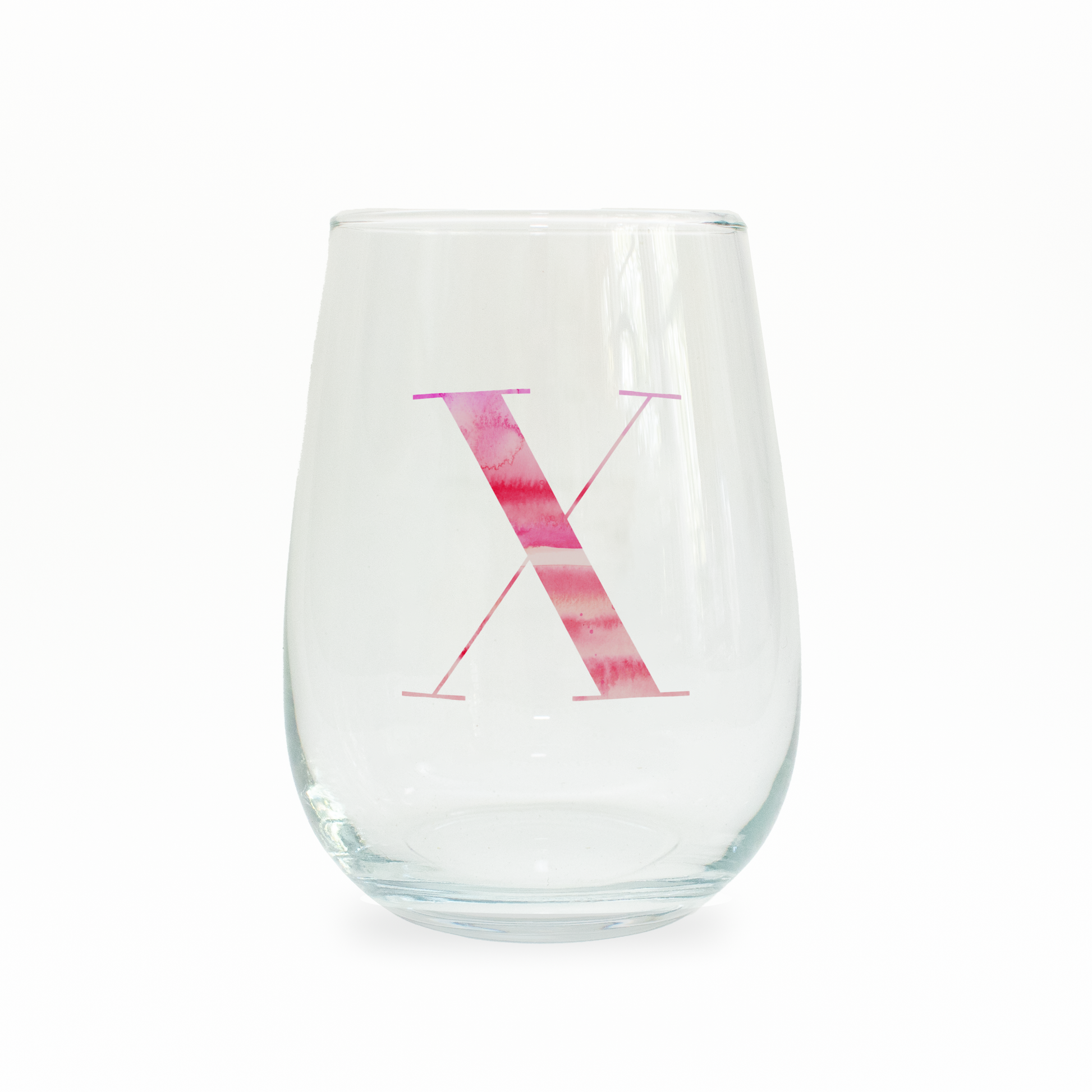 Introducing a beautiful 20-ounce stemless wineglass featuring a lovely monogram of the letter LX